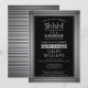 Você pode guardar um segredo? Convide a família e os amigos para uma elegante e excitante celebração de aniversário surpresa com convites de festas personalizados de papel negro e falso prata. Toda a redação desta modelo é simples de personalizar, incluindo a mensagem que diz "Shhh! É uma SURPRESA." O design apresenta uma fronteira striped moderna sobre um fundo de aço inoxidável esfregado, tipografia clássica de arte de vintage deco e caligrafia de na moda. Por favor, note que prata é cor verde de cinza impressa, não papel metálico. Este cartão pode ser personalizado para qualquer ano ou tipo de evento e é adequado para um homem ou uma mulher. Feliz Aniversário!