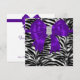 Convite de festa e evento de todas as ocasiões com modelo de listras de zebra pretas e brancas elegantes e laço de diamante roxo brilhante no centro. Escolha o estilo e a cor da fonte. Impresso sem joias ou laços reais.