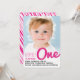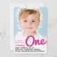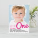 O cartão de convite de 1º aniversário desta bebezinha apresenta um esboço tipográfico moderno e ousado com título 'one' em cor rosa choque fúcsia sobreposto a uma foto com fundo branco combinando.