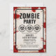 Convite com visual retrô para uma festa temática de surto de zumbis com placa enferrujada, manchas de sangue, símbolos de risco biológico e parafusos.