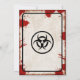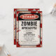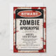Convite com visual retrô para uma festa temática de surto de zumbis com sinal de CUIDADO enferrujado, manchas de sangue, símbolo de risco biológico e parafusos.