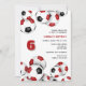 Este convite de festas de tema de futebol bonito apresenta clusters de bolas de futebol vermelhas, pretas e brancas nas bordas superior e inferior na frente e um cluster de solteiros cobrindo a parte posterior do convite - personalize os detalhes da parte em um fundo branco - por katz_d_zynes