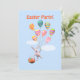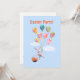 Convite para uma festa de Páscoa com minha arte de um coelhinho fofo flutuando no céu segurando um monte de balões enquanto carrega uma cesta cheia de ovos de Páscoa.