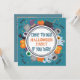 A frente deste convite para festas de Halloween tem um círculo com personagens e emblemas assustadores, incluindo fantasmas, lanternas de jack o', um gato preto, globos oculares e muito mais. O texto no meio diz: "VAMOS À NOSSA FESTA DE MALHEIRA SE VOCÊ SE OUSAR!" em azul e laranja. As imagens são colocadas sobre um fundo azul-noturno do céu. A parte de trás do convite tem bastante espaço para as suas informações personalizadas sobre o partido, e outra lanterna e imagem fantasma. Funciona bem para crianças ou adultos no Halloween, e é fácil de personalizar.