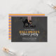 Nossas calçados de bruxa de coroa branca com meias pretas roxas e laranja. Esta design apresenta um convite de aniversário de Halloween, com laranja e preto, com bruxas bonitinhas e caprichosas, e um gato preto, uma tipografia fofa, perfeita para a festa infantil, com um simples design minimalista, divertido e assustador