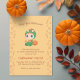 Bebê adorável vestida com uma fantasia de dragão verde com picos de laranja e combinando um bico de laranja com um crânio. Uma abóbora curvada fica um pouco para trás. Primeiro convite para festas de Halloween para bebê de qualquer sexo.