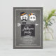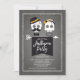 Vintage gótica halloween convite com o Sr. & Sra. Skulls com um cartaz com letra de caligrafia escrita à mão sobre fundo de cinza.
