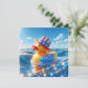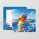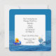 Um vibrante pato de borracha amarelo usando um chapéu com o padrão da bandeira americana flutua na água azul cintilante de um oceano para convite de festa de piscina.
