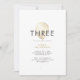Convite de festas de aniversário de 3 anos de ouro brilhante para menina, com um balão de ouro brilhante. A design é minimalista e elegante e é perfeita para a sua garotinha. O convite pode ser personalizado com o nome da sua menina e os detalhes da festa. A design baseia-se no terceiro aniversário, mas pode ser editada para incluir qualquer idade.