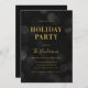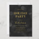 Convite para festas de Natal com as palavras "Festa de Férias" em folha de ouro falsa contra um fundo padrão de luzes escuras que é perfeito para uma festa de festas para familiares ou amigos ou até para uma festa de festas de negócios corporativos. O convite tem uma cinza escura do lado de trás. Personalize este convite com seus detalhes substituindo o texto do marcador de posição. Para obter mais opções, como alterar a fonte, o tamanho/cor do texto ou o espaçamento entre letras, clique no botão "Personalizar". *Observe que a Marca d'água do Zazzle que aparece na visualização de zoom NÃO aparecerá no produto impresso final. © Rosewood e Citrus