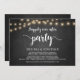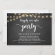 Linda festa Felizes para Sempre, cartão de anúncio / convite de casamento fugitivo, em quadro negro de fazenda rústica, design de luzes de corda. Isso é perfeito para o seu casamento e festa de celebração pós-casamento. Adicione seus detalhes no tipo / letra correspondente.