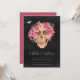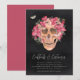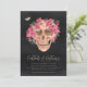 Um convite para festas de Dia das Bruxas chique assustador com uma ilustração do crânio floral, tocado com flores cor d'água cor-de-rosa num fundo preto-enfumaçado. Personalize este convite exclusivo e elegante da festa do Dia das Bruxas com os detalhes do seu evento em letras brancas. Palavra mostrada para "Figurinos e Cocktails" com uma linha extra de texto personalizado na parte inferior para compartilhar detalhes adicionais.