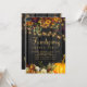 Belos bordos de flores de outono laranja enferrujado e burgundy escuro e abóboras com cordas de luzes cintilantes douradas sobre um fundo de madeira de celeiro marrom escuro criando um convite charmoso para jantar de Ação de Graças friendsgiving com uma tipografia dourada de letra manuscrita trendy. +++++++++ Fácil de personalizar com seus detalhes! Adequado para encontros tradicionais rústicos | country | farmhouse | ao ar livre no quintal com familiares e amigos.