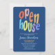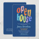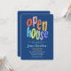 Um convite colorido e divertido para uma festa de casa aberta. Este convite fabuloso apresenta tipografia moderna e ousada em um fundo azul. Fácil de personalizar com os detalhes da sua festa de casa aberta ou aniversário.