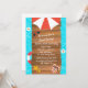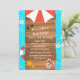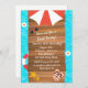 Um convite da festa na piscina com um fundo da água azul. Há uma doca de madeira para o texto e embellished com ícones do verão, tais como um guarda-chuva, óculos de sol, flip-flops e estrela do mar. Indicado como uma festa de aniversário mas pode ser personalizado para toda a festa na piscina.