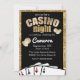 Este convite personalizado apresenta um tema brilhante e glamouroso da festa de jogos de azar Casino Night. As placas reproduzindo quatro de um tipo de ás são impressas na parte inferior. As moedas são ilustradas de ambos os lados da área do texto. O cassino é impresso num design de folha de ouro, com impressão noturna por baixo, em forma de diamantes de ouro. O quadro apresenta um padrão de diamantes correspondente sobre um fundo preto.