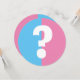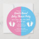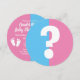 Convite modelo de festa de revelação do sexo do bebê, menino ou menina. Convites personalizados redondos cor-de-rosa e azul com ponto de interrogação para novos pais, amigos, familiares e convidados. Design personalizado. Design de forma circular recortada com pegadas de pés de bebê. Convites circulares para o recém-nascido, ele ou ela. Impressão frente e verso.