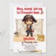 "Ahoy Matey! Junte-se a nós para a caça ao tesouro! Marque uma aventura com nosso Convite de aniversário Pirate Boy. Com um jovem e destemido buccaneiro e um mapa do tesouro, este cartão personalizável é perfeito para o dia especial do seu pirata. Adicione a idade, o nome, a data e o endereço do seu filho para torná-lo uma celebração verdadeiramente personalizada!" O cartão faz parte de um conjunto de suprimentos de festa.