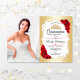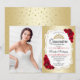 Quinceanera convite de festas com sua foto. Apresenta fontes de script, rosa vermelha, tiara e confetti. Design vermelho branco clássico com ouro brilhante. Perfeito para uma celebração elegante.