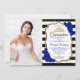 Quinceanera convite de festas com sua foto. Apresenta faixas brancas pretas, fonte de script, rosas azuis reais, tiara e confetti. Design azul branco-esbranquiçado de safira azul com ouro brilhante falso. Perfeito para uma celebração elegante.