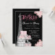 Convite de aniversário Paris Sweet 16 com uma bela Torre Eiffel prateada, pacotes elegantes de presentes em Paris, calçados de salto alto com brilho prateado e um roteiro de Paris cor-de-rosa rico num fundo floral rosa e rico. Este belo convite de 16 anos de Paris é facilmente personalizado para o seu evento simplesmente adicionando os seus detalhes no estilo de letra e cor, e a redação da sua escolha. Este é um design impresso sem diamantes reais, joias, brilho, etc.