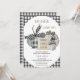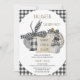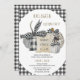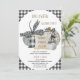 Convite de festas de fantasia de Halloween. Design de fazenda russa com abóboras serricas, xadrez de búfalo, travesseiros de varanda, abóbora assustadora com arcos rastejantes e de fita.