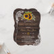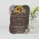 Cartão de casamento rústico com buquês de girassóis em aquarela, forma semitransparente com moldura texturizada, flechas com corações e girassóis como divisor, tudo sobre um fundo de velho celeiro. Use a ferramenta de personalização para adicionar suas informações. Itens correspondentes podem ser encontrados na minha Coleção de Girassóis Rústicos Velho Celeiro.