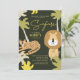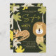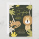 Convocando todos os pequenos exploradores para uma Safari Africana. O convite apresenta um leão e uma chita sentados entre palmeiras e vegetação que criam a moldura para o texto perfeito para uma celebração selvagem!