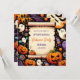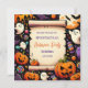O design apresenta um pergaminho envelhecido no centro, fornecendo um espaço de vazio para o texto. Ao redor do pergaminho estão vários ícones do Halloween, incluindo lanternas sorridentes, fantasmas com diferentes expressões, milho doce, lábios coloridos de Halloween, aranhas pretas e morcegos. O fundo é um roxo profundo com padrões sutis, criando uma atmosfera lúdica e assustadora perfeita para um convite de Halloween.