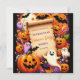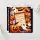 O design apresenta um pergaminho envelhecido no centro, fornecendo um espaço de vazio para o texto. Ao redor do pergaminho estão vários ícones do Halloween, incluindo lanternas sorridentes, fantasmas com diferentes expressões, milho doce, lábios coloridos de Halloween, aranhas pretas e morcegos. O fundo é um roxo profundo com padrões sutis, criando uma atmosfera lúdica e assustadora perfeita para um convite de Halloween.