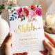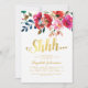 Convites de festa surpresa elegantes com um fundo branco clássico, exibição floral em aquarela, um título tipográfico em folha de ouro falso elegante e um modelo de celebração moderno.