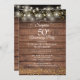 Com delicados corações de amor dourados em confete e luzes de corda bonitas em um fundo de painéis de madeira rústica. Personalize com as informações da sua festa surpresa de aniversário de cinquenta anos em letras elegantes. Criado por Thisisnotme©
