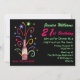 Convite de festas colorido do aniversário de 21 anos do divertimento feito no preto, com cores brilhantes vibrantes. Os gráficos do divertimento de uma garrafa cor-de-rosa do champanhe, com as estrelas de tiro e as flâmulas que cercam a, decoram o lado esquerdo do convite. O texto no rosa e no verde está pronto para personalizar para seu dia grande. Personalize para adicionar o texto à parte traseira do cartão.