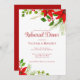 Este convite clássico de janto de ensaio vermelho e verde apresenta flores poinsettia brilhantes na parte inferior direita do seu convite e bagas sagradas e verde no topo à esquerda. Um convite festivo e brilhante para um casamento de Natal com roteiro vermelho.