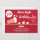 Um convite de aniversário noturno de cinema para crianças (ou crianças de coração) com pipocas sorridentes e personagens de desenho animados de bebidas. O convite tem um esquema de cor vermelha e branca que inclui um fundo vermelho. Todas as palavras podem ser personalizadas.