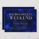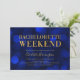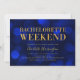 Convite de festa de solteira clássico com a menção "Bachelorette Weekend" em folha de ouro falsa contra um fundo padrão de luzes azul-sapphire. O convite tem um fundo azul atrás. Você também pode adicionar o itinerário no verso, se desejar, clicando em "personalizar" e adicionando texto. Personalize este convite com seus detalhes substituindo o texto do marcador de posição. Para obter mais opções, como alterar a fonte, o tamanho/cor do texto ou o espaçamento entre letras, clique no botão "Personalizar". *Observe que a Marca d'água do Zazzle que aparece na visualização de zoom NÃO aparecerá no produto impresso final. © Rosewood e Citrus