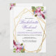 Flores tropicais em rosa suave e roxo em aquarela dentro de uma moldura geométrica dupla dourada apresentam floreios botânicos e festivos. Personalize este convite de fim de semana de despedida de solteira com suas próprias cores e fontes ou mantenha esta tipografia popular como está para sua conveniência. Misture e combine com outros itens desta linda coleção de casamento.