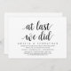 Cartão de convite de fuga de noivos temático de roteiro moderno (Finalmente, nós fizemos). É perfeito para o seu jantar de fuga de noivos casual à beira do lago, dança e festa.
