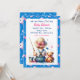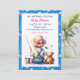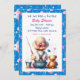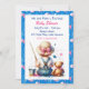 Uma ilustração adorável e doce da aquarela de uma menina em suspensórios bonitinhos pescando com um ursinho de pelúcia. As cores desses convites incluem azul e rosa.