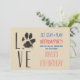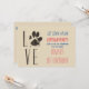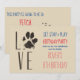 Um convite de festa de aniversário para o seu cachorro. A frente é desenhada com uma ilustração fofa com uma impressão de pata de cachorro marrom. Com letras que formam a palavra amor. A parte de trás tem um rastro de pegadas.