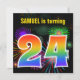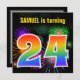 Este design de convite de aniversário vibrante e divertido apresenta um padrão de fogos de artifício celebratórios coloridos, inspirado no espetáculo, juntamente com o número "24", que inclui um espectro multicolorido como o arco-íris ou um padrão de gradiente. O nome na frente pode ser personalizado. A parte traseira contém informações personalizáveis sobre a parte. Convites de festas de aniversários como este podem ser enviados para convidar convidados para uma festa de aniversário que se realiza para celebrar o vigésimo quarto aniversário de alguém. [~Z0000337]