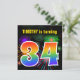 Este design de convite de aniversário vibrante e divertido apresenta um padrão inspirado em fogos de artifício celebratórios coloridos, junto com o número "34", que tem um espectro de inspiração multicolorido no arco-íris ou um padrão de gradiente. O nome na frente pode ser personalizado. A parte traseira contém informações personalizáveis sobre a parte. Convites de festas de aniversários como este podem ser enviados para convidar convidados para uma festa de aniversário que comemora o trinta e quatro anos de alguém. [~Z0000337]