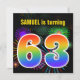 Este design de convite de aniversário vibrante e divertido apresenta um padrão colorido inspirado em fogos de artifício comemorativos que explodem, juntamente com o número "63", tendo um espectro multicolorido como o arco-íris ou um padrão de gradiente. O nome na frente pode ser personalizado. A parte traseira apresenta detalhes personalizáveis sobre a parte. Convites de festas de aniversários como este podem ser enviados a potenciais convidados para uma festa de aniversário que comemora o sexagésimo terceiro aniversário de alguém. [~Z0000337]