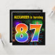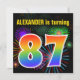Este design de convite de aniversário vibrante e divertido apresenta um padrão de inspiração para fogos de artifício celebratórios coloridos, juntamente com o número "87", que inclui um espectro de inspiração multicolorido no arco-íris ou um padrão de gradiente. O nome na frente pode ser personalizado. A parte traseira contém informações personalizadas sobre a parte. Convites de festas de aniversários como este podem ser usados para convidar convidados para uma festa de aniversário que está sendo realizada para celebrar o oitenta e sétimo aniversário de alguém. [~Z0000337]