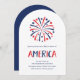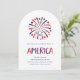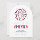 Estes elegantes e divertidos convites de festas vermelhos, brancos e azuis do Dia da Independência apresentam fogos de artifício e estrelas vermelhos e azuis, e texto moderno que diz "América". O convite é uma forma de arco, mas você pode facilmente mudar a forma, assim como a redação, para refletir seu próprio tipo de celebração patriótica no dia 4 de julho.