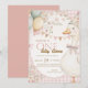 First birthday invitation featuring a playful goose design in a pink checkered pattern