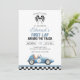 This fun 1st birthday party invitation features a vintage blue race car and chequered flags. Designed by Thisisnotme©