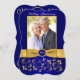Este convite de foto de aniversário de casamento de 50 anos, com flores em azul real e dourado com arabescos, tem uma fita dourada IMPRESSA e uma medalha azul e dourada com aparência de gravura FALSA IMPRESSA. Possui uma área de modelo para você carregar sua própria foto digital. Você pode remover o texto estilizado em cursiva "Aniversário de Casamento" ou "50º". Todo o texto é personalizável, assim como as opções de papel. ****POR FAVOR, OBSERVE que se você mudar para papel metálico dourado, é um dourado muito escuro e alterará as cores do design (transformando a foto em dourada, etc.), então NÃO sugiro usar esse papel. O papel de feltro também alterará ligeiramente a cor da sua foto. ALÉM DISSO, se você alterar as fontes ou tamanhos de fonte, seu texto pode não caber mais corretamente. O Zazzle não editará nada para erros de digitação, alinhamento ou qualquer outra coisa, e eu não verei seu convite. Tudo será impresso como aparece no seu monitor. Se precisar de ajuda com o convite, por favor entre em contato comigo ANTES de fazer o pedido. Este convite é projetado para se ajustar ao cartão de tamanho 5x7 com forma CURVA. Se você mudar para outro tamanho/forma, o design não se ajustará mais corretamente, então