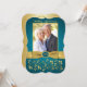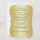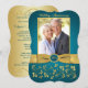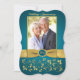 Este convite de fotografia para o aniversário de 50 anos de casamento, com um floral azul-esverdeado elegante e dourado com arabescos, tem uma fita dourada IMPRESSA e uma medalha azul-esverdeada e dourada com aparência de FALSA GRAVURA. Possui uma área de modelo para você carregar sua própria foto digital. Você pode remover o texto estilizado em cursiva "Aniversário de Casamento" ou "50º". Todo o texto é personalizável, assim como as opções de papel. ALÉM DISSO, se você alterar as fontes ou tamanhos de fonte, seu texto pode não caber mais corretamente. A Zazzle não editará nada para erros de digitação, alinhamento ou qualquer outra coisa, e eu não verei seu convite. Tudo será impresso como aparece na tela do seu monitor. Se precisar de ajuda com o convite, por favor entre em contato comigo ANTES de fazer o pedido. Este convite foi projetado para se ajustar ao cartão de tamanho 5x7 com forma CURVA. Se você alterar para outro tamanho/forma, o design não se ajustará mais corretamente, então