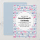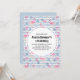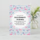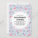 Convite de festa de aniversário com um padrão divertido e estival. Flamingos rosa e abacaxis postos em um padrão listrado azul claro com folhas e corações ao redor.